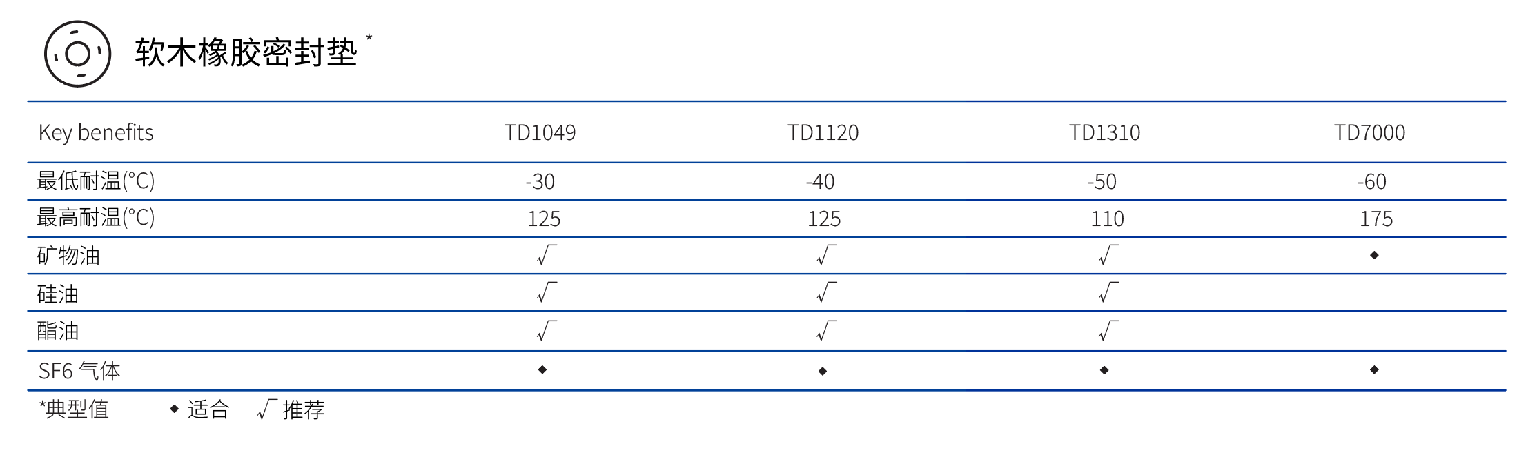 AMORIM阿莫林軟木橡膠密封材料TD1120、TD1049、TD1310、TD7000因其良好的機械性能、耐變壓器油等特性廣泛應用于變壓器行業(yè)。詳細參數如下: